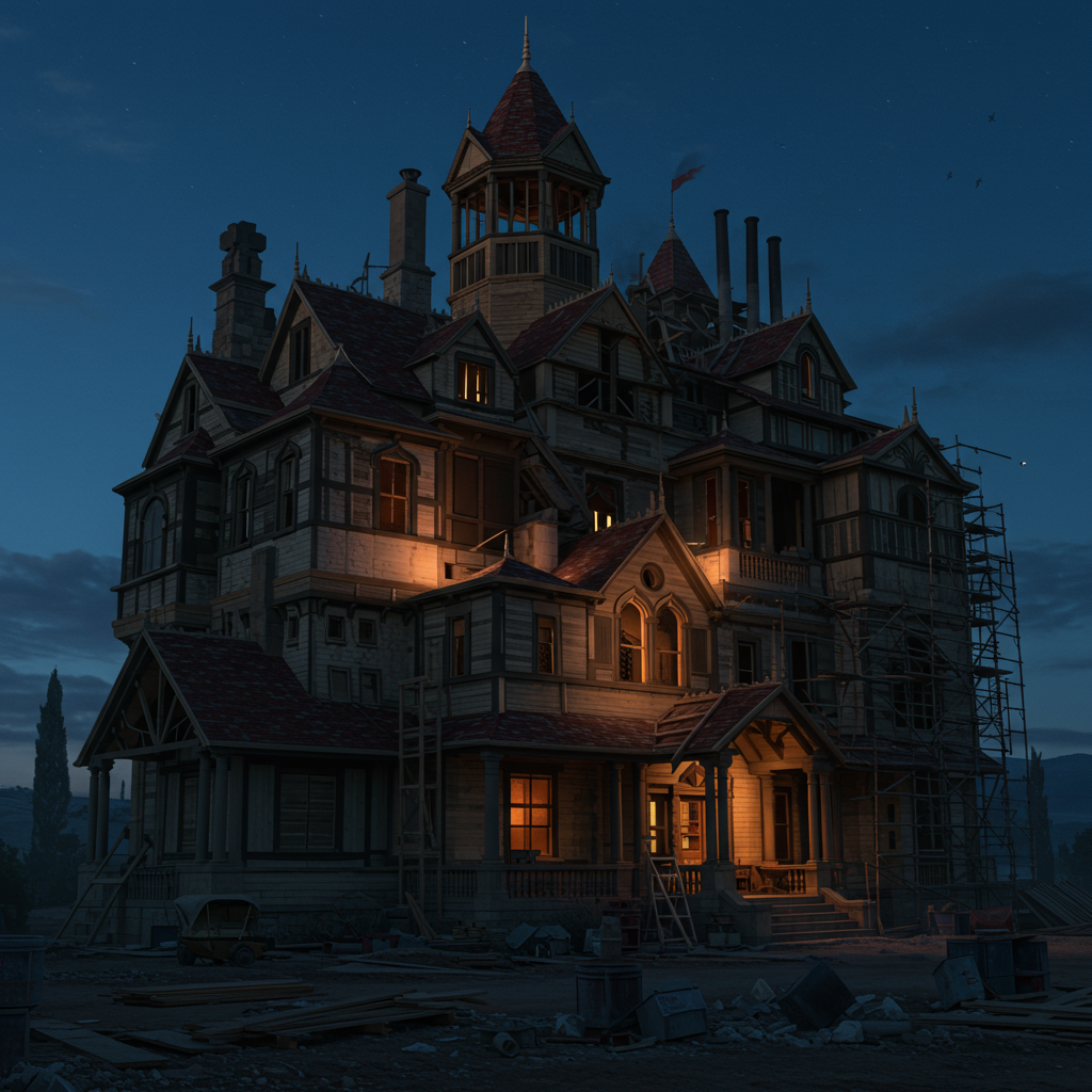 영매의 말을 들은 사라는 캘리포니아 산호세에 작은 농가를 구입했습니다. 그리고 1886년부터 그녀가 죽는 1922년까지, 무려 38년 동안 24시간 내내 공사를 멈추지 않았습니다. 밤낮으로 망치 소리가 끊이지 않았고, 집은 마치 살아있는 유기체처럼 계속해서 자라났죠. 이 광기 어린 증축은 오직 그녀의 믿음 하나로 유지되었습니다.